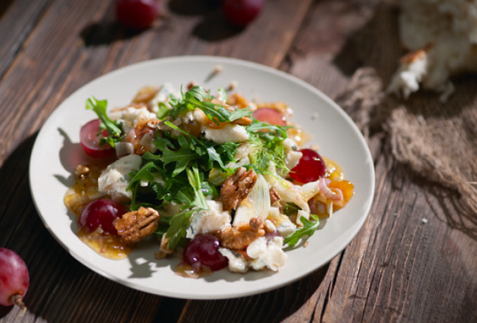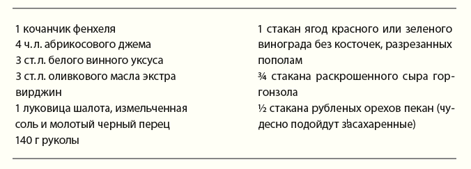 Разнообразие ароматов и текстур в этом салате рождает и сложный, и утонченный вкус одновременно. Сладость винограда и абрикосов оттенена кислинкой в рукколе, а фенхель создает анисовое послевкусие. Сочетание плотных орехов, хрустящего фенхеля, тягучего варенья и упругих виноградин — это настоящий праздник.